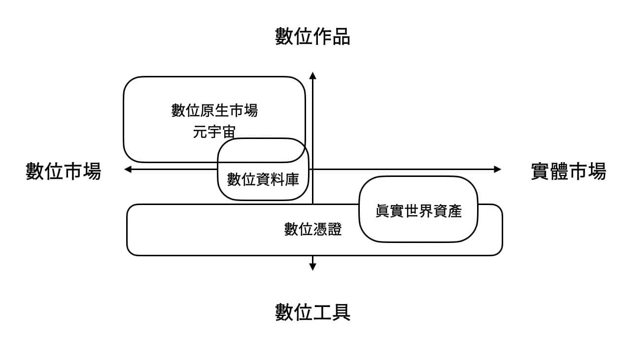 我們在此可畫出一個二維光譜解釋web3如何為藝術品交易市場帶來數位轉型,縱軸為「數位作品——數位工具」,橫軸為「數位市場——實體市場」。