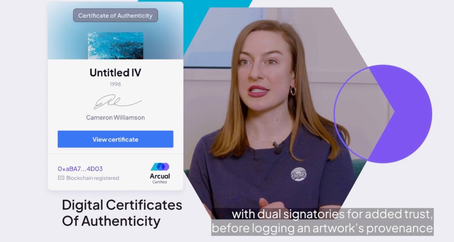 在Arcual的案例,這些節點以藝廊、拍賣行與專業投資人為主,散戶不被允許加入其中。其交易並不以加密貨幣計價,而是採用法定貨幣,這意味著Arcual只採用了區塊鏈數位憑證作為服務的部分。此外,Arcual包含數位認證(CoA)、交易溯源(Provenance)與將藝術家與藝廊的自動化分潤(Royalty Splits),以上都是公共區塊鏈的數位藝術交易平台常見的功能,Arcual意圖將此功能轉移至實體藝術品的貿易世界。