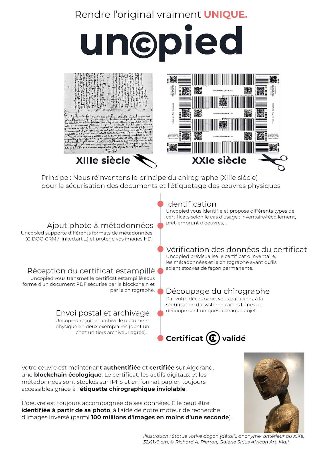 UNCOPIED發展了一套機制,將QR Code、條碼(Barcode)與文字建構在五等分騎縫契據(Quintuplicate Chirograph)上,而QR Code將指向分散式儲存服務星際檔案系統(IPFS)與公共區塊鏈Algorand的NFT數位憑證上。因此作者、買家、公共組織與公共館舍將可以共同持有作品證明書,並同時將數位認證託管於第三方數位空間,讓公共區塊鏈成為第三方公證人。該組織已於2021年10月發行第一個公證服務,應用於收藏家Richard A. Pierron的財產,一尊來自西非的雕像。