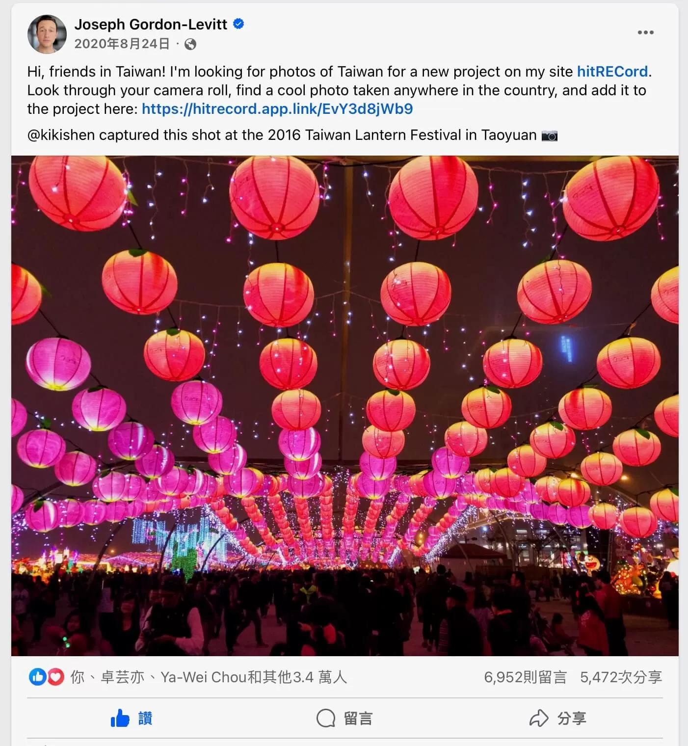 四年前在疫情期間,喬瑟夫曾經在臉書上發文募集臺灣的影像,說要來剪成一齣集體共創的短片,以宣傳臺灣。(圖片截自喬瑟夫的臉書文章)