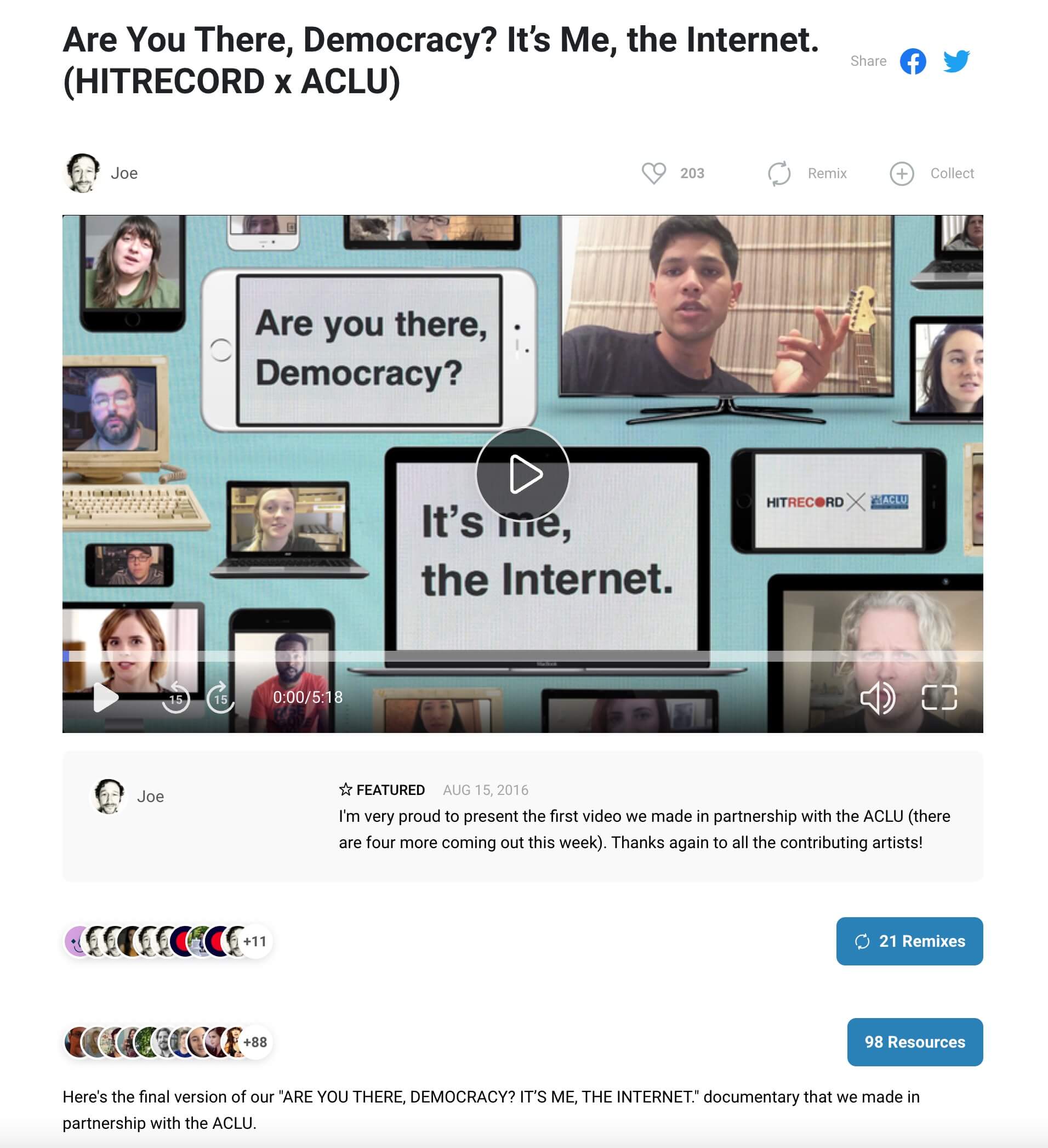 《民主,你在嗎?我是網路》於HITRECORD頁面,可以看到「資源」與「重混」的使用狀態。當然,你可以在平台上面看完整部短片;當然,你也可以再拿它來Remix!目前就有21個使用者再拿它來Remix。(圖片截自HITRECORD頁面)